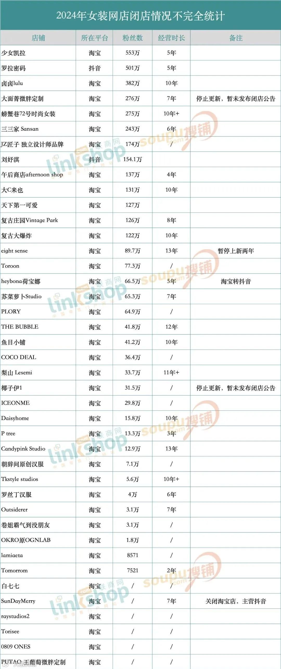 据不完全统计,2024年以来,已有不下40家女装网店宣布闭店或停止上新,其中不乏一些经营10年以上的老牌店铺和高分店铺。