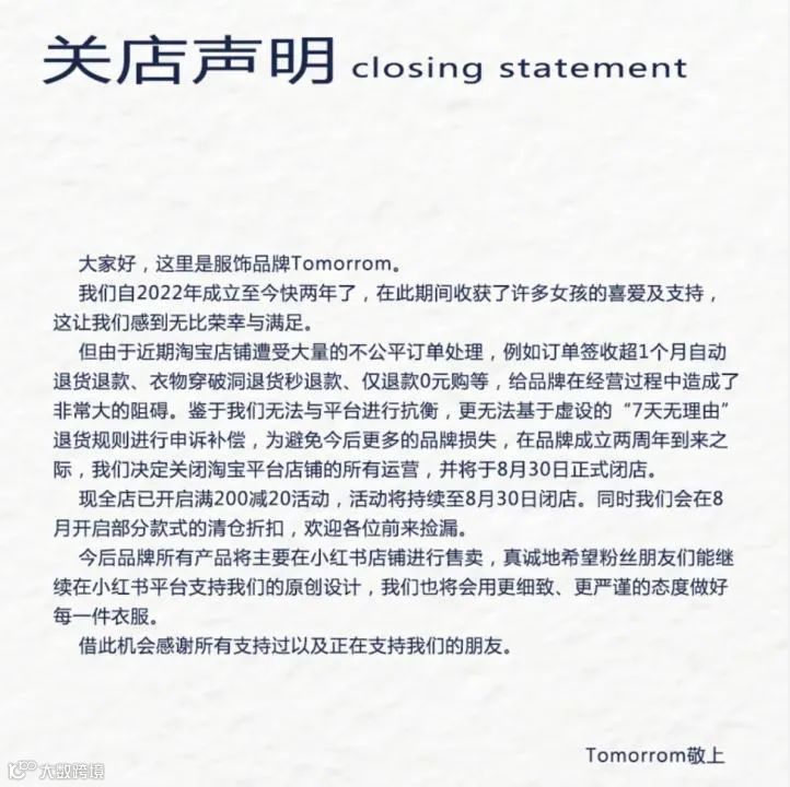 以成立两年的网红女装店铺Tomorrom为例,其在闭店公告中直接指出了近期所遭遇的严峻挑战——“大量不公平订单处理”问题频发。
