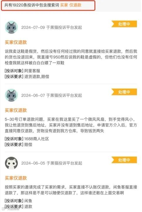 值得注意的是,打开黑猫投诉平台,并输入关键词“买家仅退款”进行搜索时,不难发现,类似Tomorrom所遭遇的“仅退款”问题并非个例,而是广泛存在于诸多商家中。