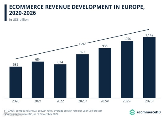 京东的供应链出海,不仅仅是为了应对海外市场的挑战,更是顺应了跨境电商行业的发展趋势。据EcommerceDB预测,2023年欧洲电商市场将再次迎来高速增长,市场规模有望在2026年超过1.1万亿美元。