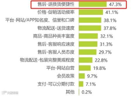 据艾瑞咨询的研究报告显示,2023年,网购用户对退换货便捷性的重视程度跃居第三位,占比近半。