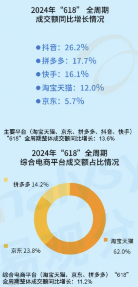 根据星图数据,本次618大促,综合电商平台、直播平台累积销售额为7428亿元。而在易观数据中,淘宝天猫、京东、拼多多三个综合电商平台同比增长11.2%。