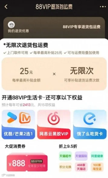 今年4月,淘宝88vip推出了无限次退货包运费服务,另外还对折扣、积分兑换等多个政策进行了优化。