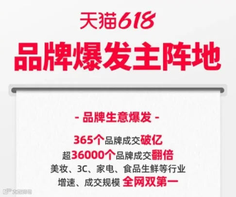 截至6月18日24点,共有365个品牌在天猫618期间成交额破亿,超过36000个品牌成交额实现翻倍增长。