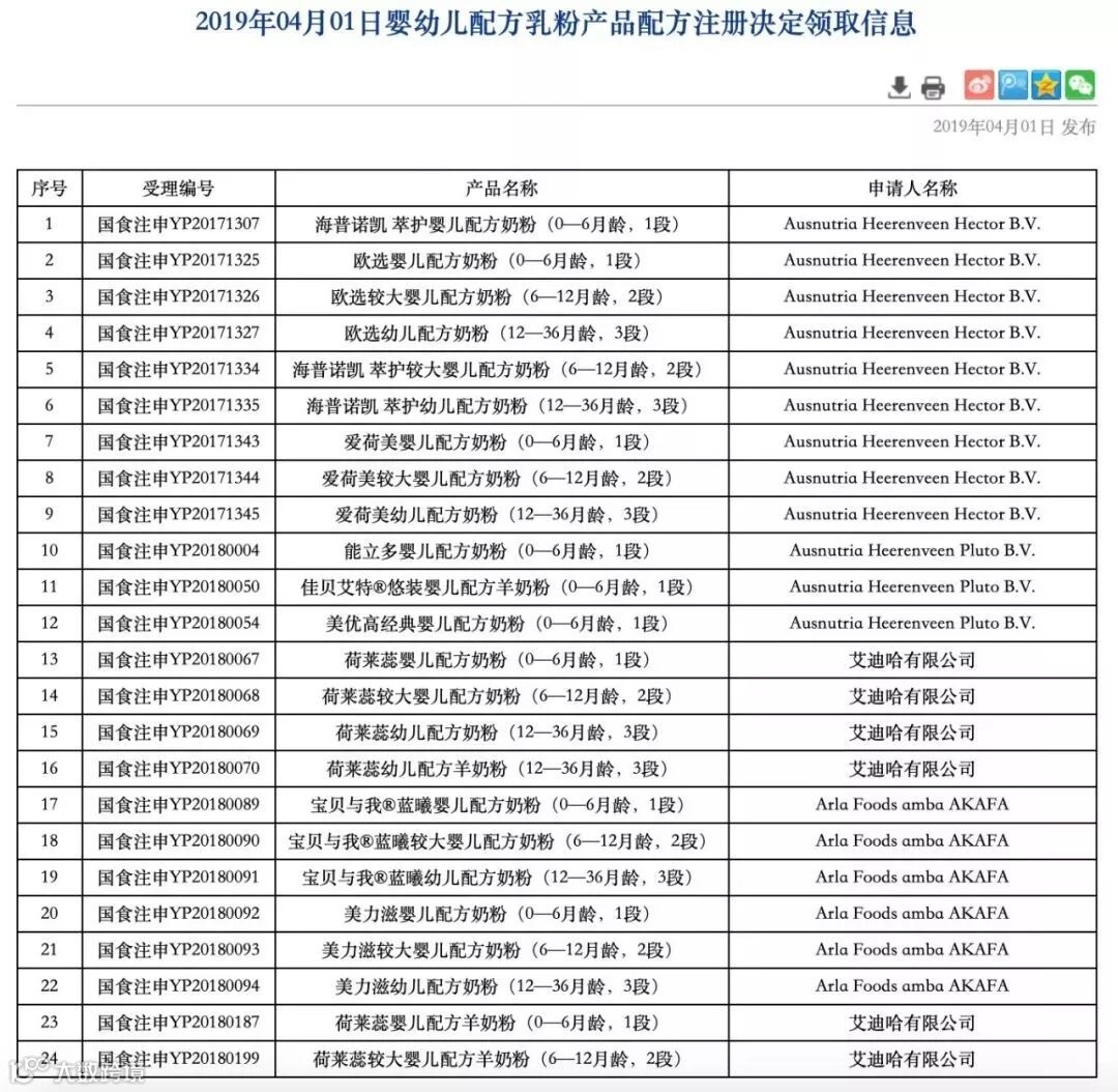 《2019年04月01日婴幼儿配方乳粉产品配方注册决定领取信息》正式发布,公布了第46批通过注册的配方名单。此次共有来自Arla、艾迪哈、Ausnutria Heerenveen Hector B.V. 3家企业的海普诺凯萃护、康维多荷莱蕊(牛、羊)、爱荷美等10个系列、24个配方获批。
