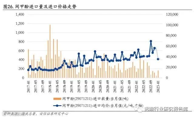 间甲酚:全球产能约6万吨,其中国内占比20%。海华科技产能8000吨,为国内最大生产商。2018年国内市场占有率达31.93%,国内销量占比61%。2022年新建1万吨产能投产,反倾销政策推动进口替代,价格中枢上移至5-6万元/吨。
