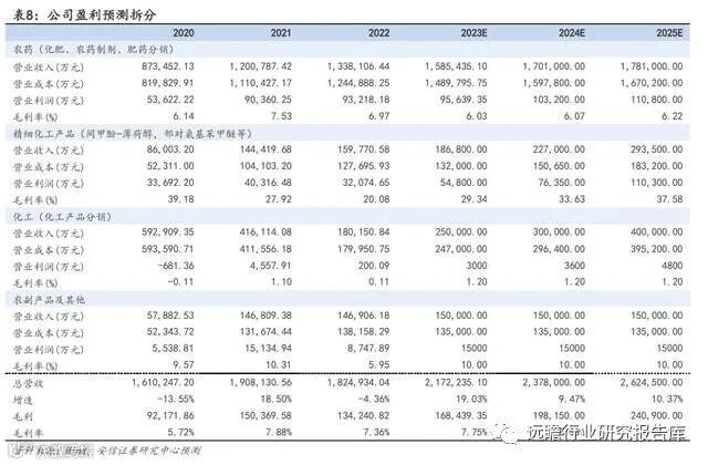 - 农药板块:复合肥因新产能释放推动产销增长,价格按当前低位测算;氯虫苯甲酰胺预计2024年起贡献利润;分销业务年增速约10%,毛利率稳定。