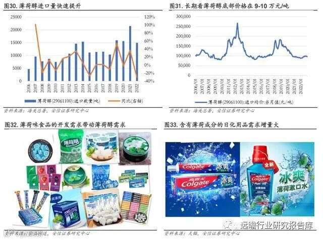 国内薄荷醇长期依赖进口,进口价约9-10万元/吨。随着国产产能释放,合成产品有望抢占天然市场,提升市占率。过去20年我国进口量增长近20倍,未来五年需求复合增速预计5%-10%。