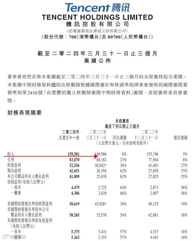 今年第一季度,腾讯营收1595.01亿元,同比增长6%;毛利838.7亿元,同比增长23%;净利润(Non-IFRS)502.65亿元,同比增长54%。