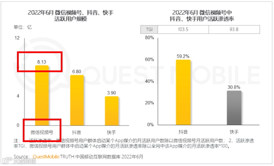 另据QuestMobile数据,截至2022年6月份视频号的活跃用户规模达到8.13亿,已超过抖音(6.8亿)和快手(3.9亿)。