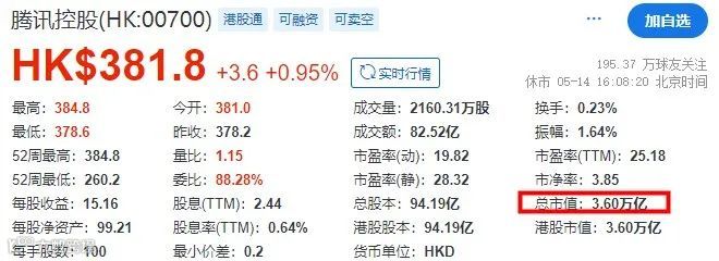 财报发出当日,腾讯股价一度上涨1.75%至384.8港元/股,收盘时涨0.95%报收于381.8港元/股,市值达到3.6万亿港元。