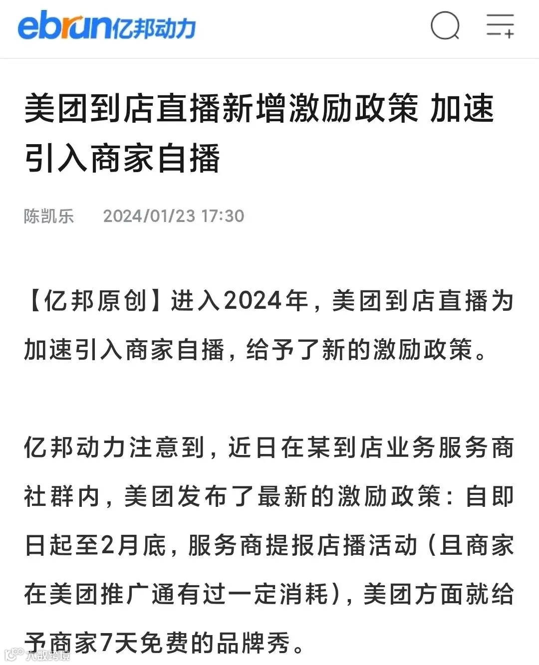 今年以来,美团到店直播还加大了对商家自播的引入力度,通过提供激励政策,如免费品牌秀等,吸引更多商家参与。