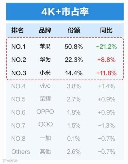 可见,在高端机市场上,华为和小米对苹果的冲击不小。