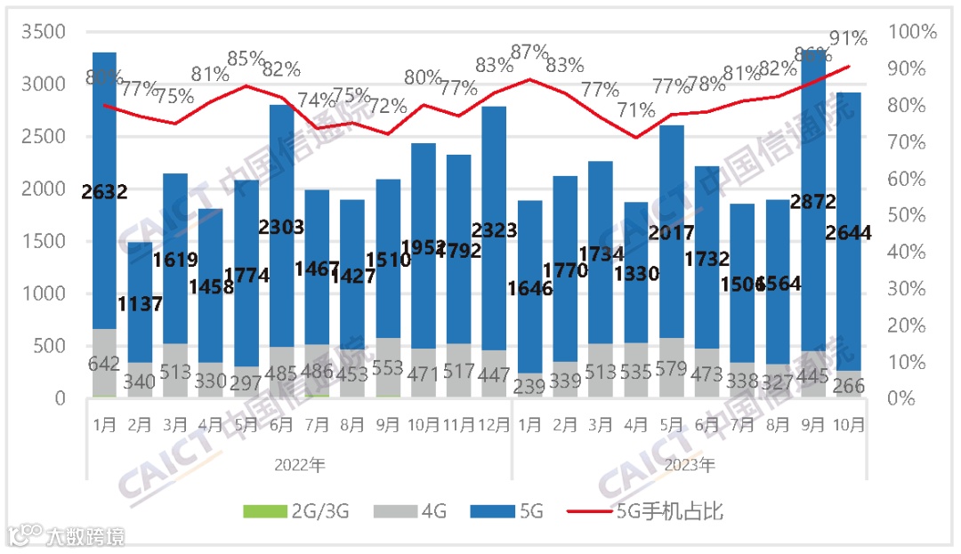 中国信通院数据显示,2023年1-10月,国内市场手机总体出货量累计2.30亿部,同比增长4.2%。其中,5G手机出货量1.88亿部,同比增长8.9%,占同期手机出货量的81.9%。