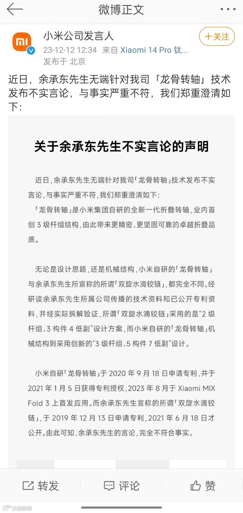 虽然并没有直接点名小米, 但明眼人都知道指的是小米的“龙骨转轴”技术。对此,12月12日,小米公司发言人官博发文回应,余承东针对小米的龙骨转轴技术,发布不实言论,与事实严重不符。