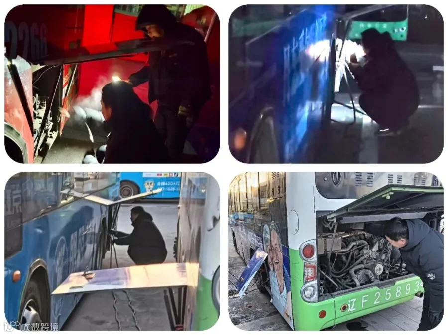 低温是车辆启动的“拦路虎”,尤其是在极端降温天气下,车辆发动机、电瓶等关键部件易出现故障。为确保每一辆公交都能顺利启动、平稳运行,修理工到岗便立刻投入紧张的工作中。他们穿梭在停车场的车辆之间,逐一检查车辆制动系统、转向装置、暖风设备,重点排查电瓶亏电、管路结冰等冬季高发问题,对存在隐患的车辆及时处理;同时有条不紊地启动车辆进行预热,让发动机保持活性,更确保车厢暖风系统提前运转,让市民上车就能感受到融融暖意。