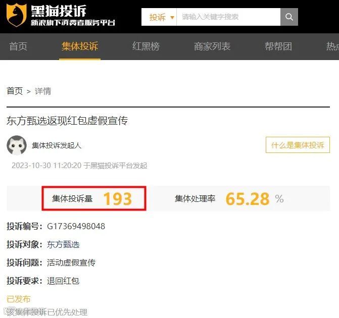 近日,有多名消费者在黑猫投诉平台向东方甄选发起集体投诉,他们认为东方甄选涉嫌虚假宣传、误导消费者高价购买,要求退回红包。