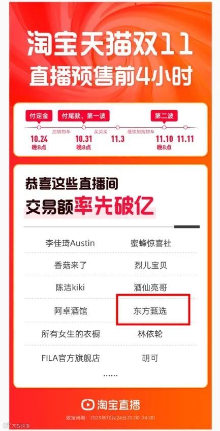 根据最新披露,淘宝天猫双11直播预售前4小时,东方甄选创下了全网单日直播带货最高纪录。天猫双11开卖首日,东方甄选等亿元直播间数量再创新高。