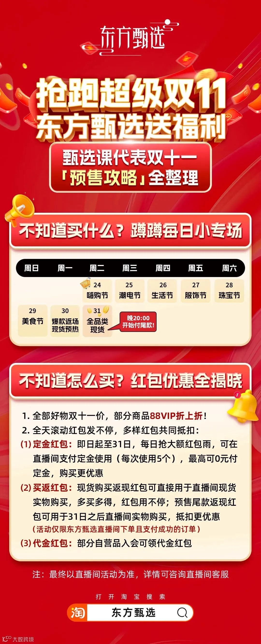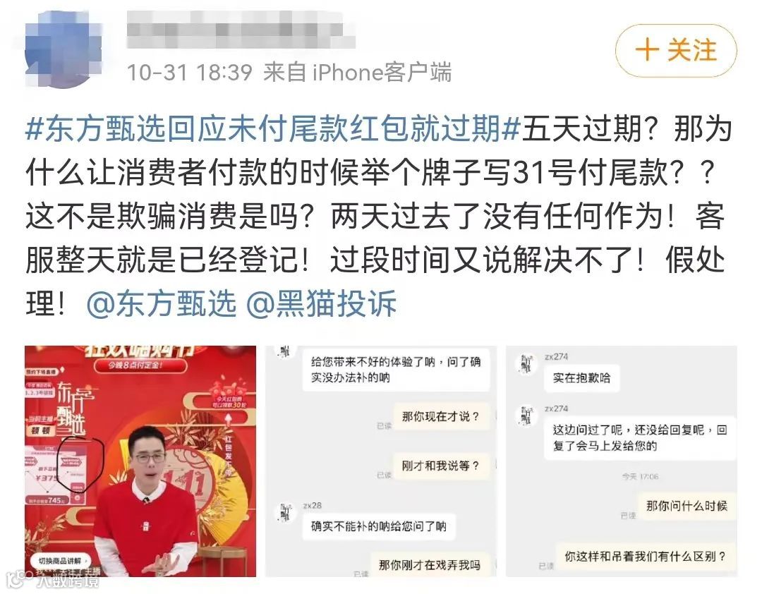 据了解,东方甄选于10月24日开启双11预售,10月31日晚八点开始付尾款。在双11付尾款的关键节点上,一些消费者甚至因红包过期而选择了退货。