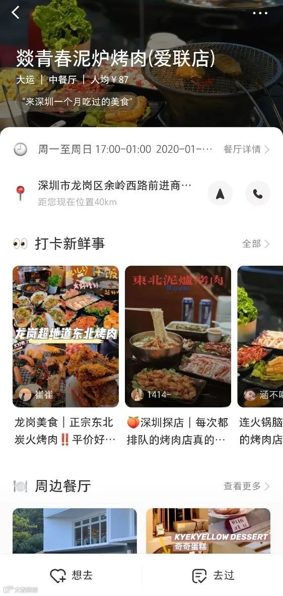 详情页,里面不仅有餐厅的地址、人均消费和营业信息等基础功能,还聚合了相关的笔记内容,集中展示人气菜品、打卡笔记、探店视频、周边餐厅等信息。