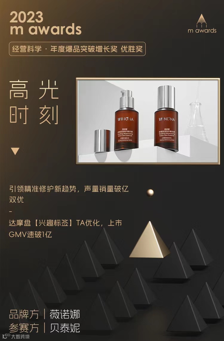 此外,明星产品薇诺娜舒缓保湿特护精华,于近日荣获阿里妈妈m awards「年度爆品突破增长奖」。本届阿里妈妈m awards历经达摩盘DEEPLINK经营科学初审与专家评审终审评估,于一众优质爆款产品中,选出高质量星品,薇诺娜舒缓保湿特护精华便是其中之一。