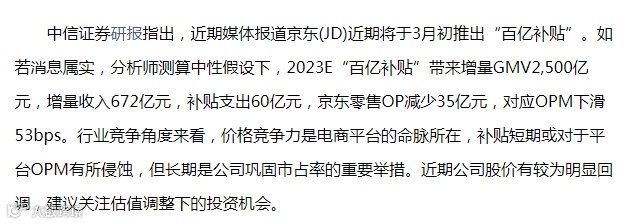 同时,有研究机构指出,预计百亿补贴对京东利润的影响可控。行业分析师认为补贴短期或对于平台OPM有所侵蚀,但长期是公司巩固市占率的重要举措。