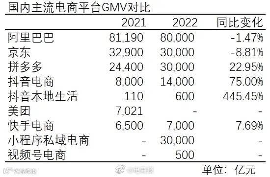 一方面,抖音、快手用了三年时间,夺走了10%左右的市场份额。另一方面,淘宝、京东、拼多多业绩明显放缓,甚至出现负增长。