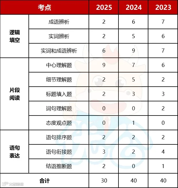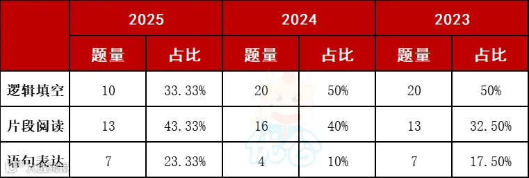 ✅综合2022—2025年言语理解与表达各板块考点的占比如下: