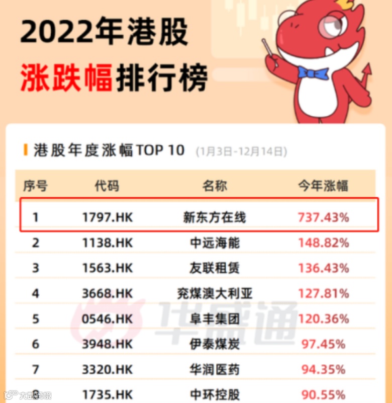 回望2022全年股市,港股整体表现不尽如人意,但此前遭遇重创的在线教育板块却迎来了股价复苏,其中最亮眼的便是新东方,位居2022年港股涨幅排行榜榜首,涨幅达到惊人的737.43%。