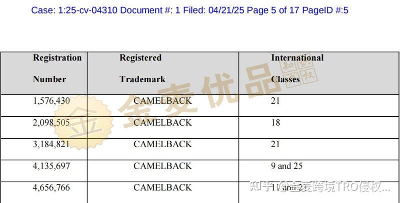 HSP律所代理美国知名品牌Camelbak立案维权,涉及多个品类,案件详情如下: