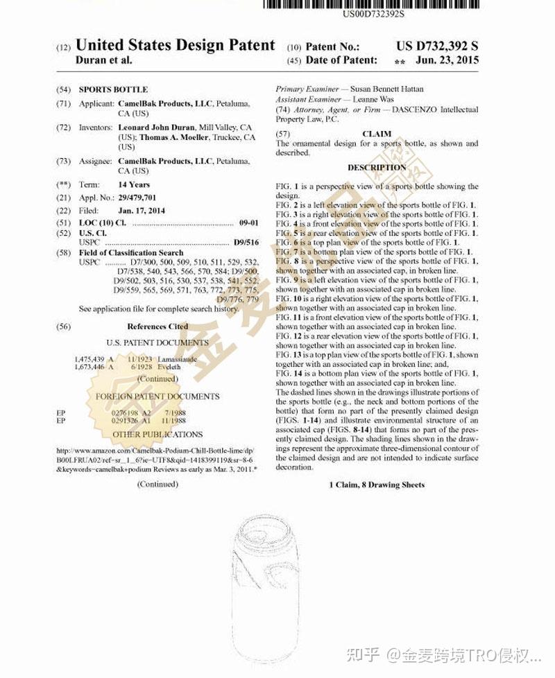 Camelbak 美国商标分别注册在第9、11、18、21和25大类,涵盖净水器、防护服、运动水壶、背包补水系统等多个品类;除此之外还注册有水壶外观专利,专利号为D732392。足以证明Camelbak Products, LLC对其知识产权的重视,跨境卖家在选品时,需注意规避,避免未经授权上架销售,给店铺带来TRO冻结风险。HSP本次代理Camelbak Products, LLC维权主要针对Camelbak商标维权,但其外观专利侵权的潜在风险也不可忽视!