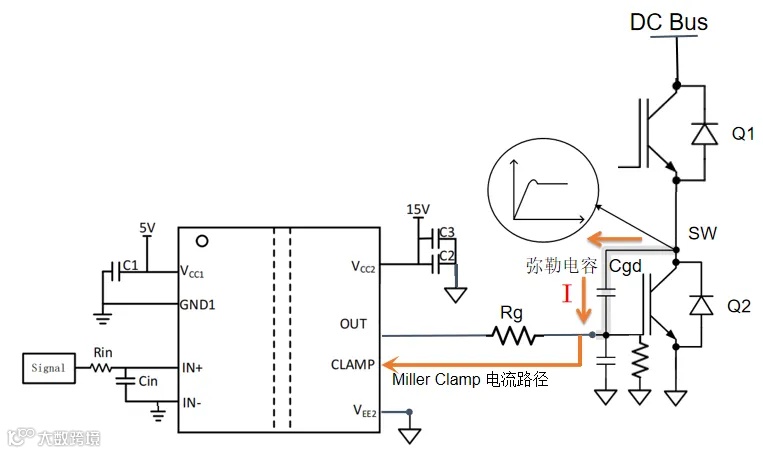 集成弥勒钳位功能,NSi6601M可以检测到gate电压的变化,当gate产生的电压高压2V时,NSi6601M内部弥勒钳位功能将被开启,将dv/dt 通过Cgd产生的电流以最小阻抗路径释放到VEE,在gate电压钳位到足够低的电压,防止下管Q2误开通。