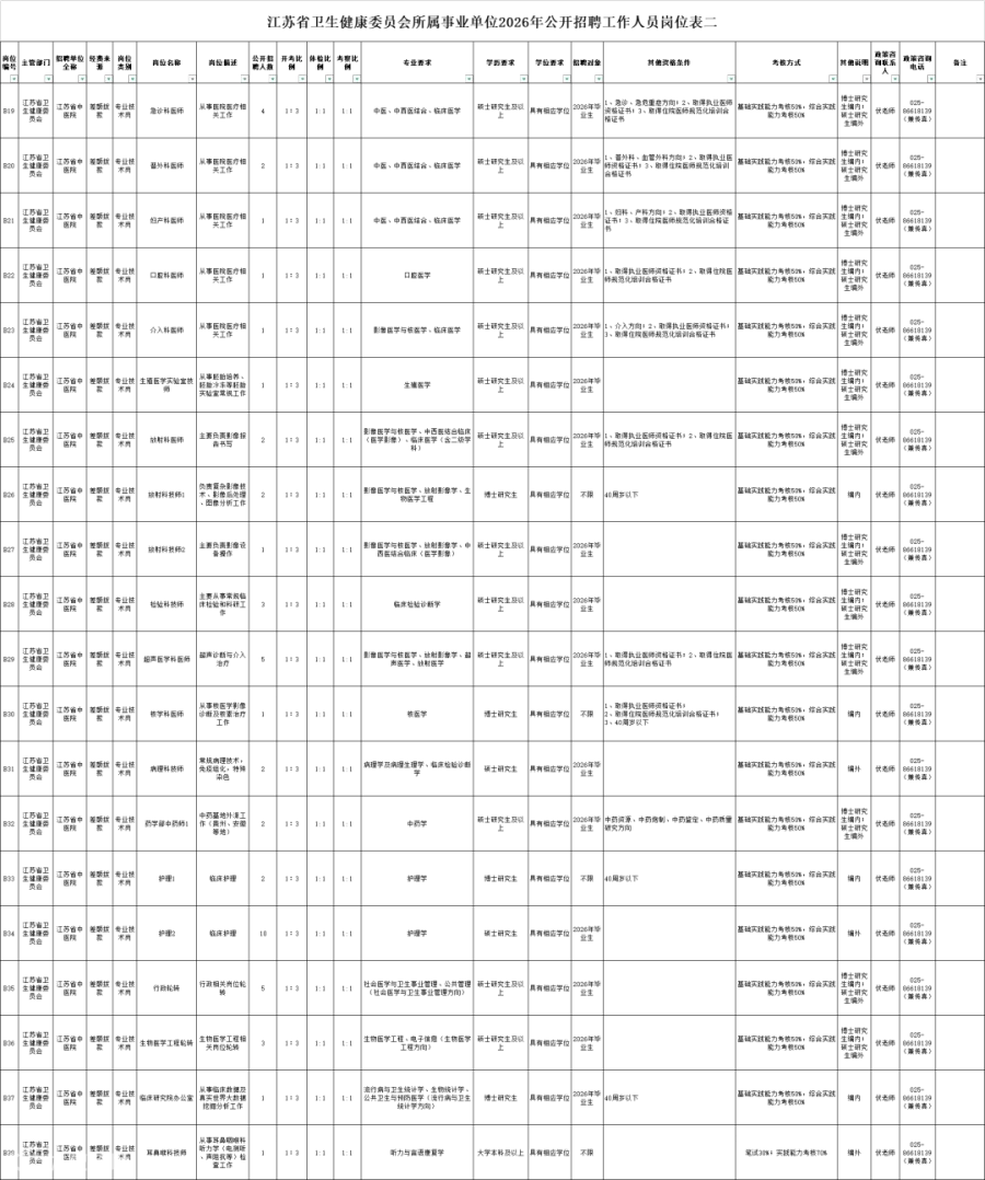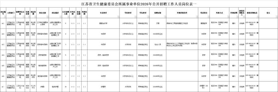 5、具备报考岗位要求的资格条件(详见附件),其中“专业”条件按《江苏省2026年考试录用公务员专业参考目录》设置,专业条件中还包括部分未列入专业参考目录但确有高等学校开设且有事业单位需要的专业。大学本科及以上学历应聘人员须同时具有相应学历和学位证书,且学历学位证书上的毕业专业与应聘专业相一致。