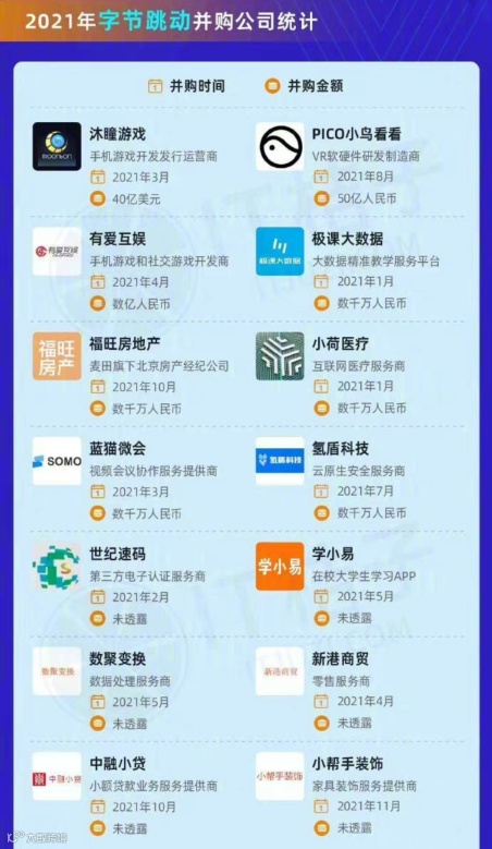 与腾讯的投资对象遍布全网的各个角落不同,字节跳动对“并购”情有独钟。