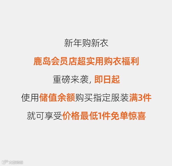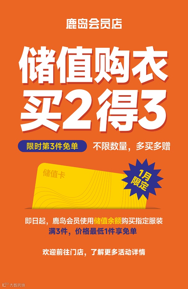 导读:鹿岛会员店 | 储值购衣,买2得3,限时第3件免单