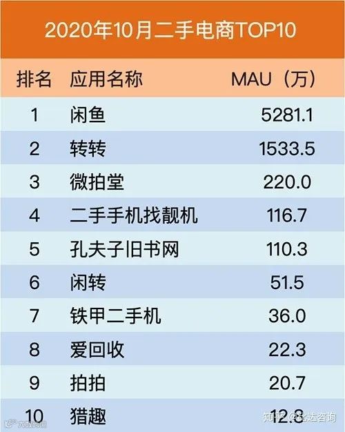 比达数据显示,2020年10月,闲鱼和转转在二手电商APP的活跃用户排名中,名列冠亚军。两家也是仅有的超过千万级用户的二手电商平台,寡头地位极为凸显。
