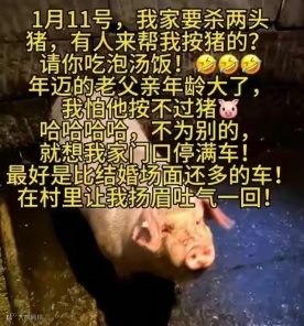 1月9日随手发了条短视频求助:“家里杀年猪,爸妈按不动,谁有空来帮忙?事成请吃刨猪汤”,结尾还补了句“想让家门口停满车,在村里扬眉吐气一回”。