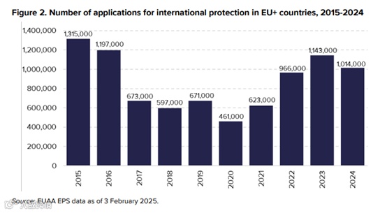 欧盟庇护局数据显示,2023、2024年连续两年收到超百万份庇护申请,接近2015—2016年高峰。