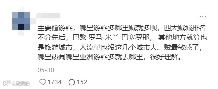 网友总结欧洲四大贼城:巴黎、罗马、米兰、巴塞罗那。亚洲游客密集之地,便是小偷活跃之所。
