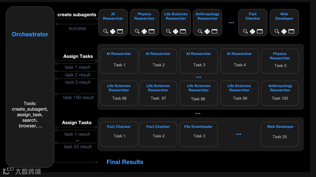 系统可瞬间创建并调度多达100个子智能体,协同调用超过1500种工具,形成高度并行的工作流,显著缩短全网搜索、数据分析等耗时任务的响应周期。
