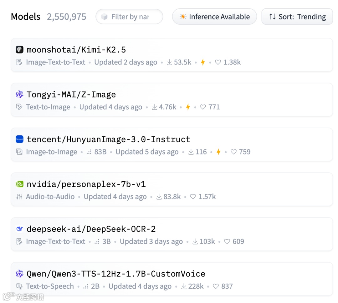 开源模型热度持续攀升,Kimi K2.5近期登顶Hugging Face趋势榜首位,下载量突破5.3万次。