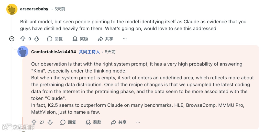 针对K2.5偶现自称“Claude”的现象,团队解释称,因训练数据中大量高质量编程内容涉及Claude,导致模型出现类似“口头禅”的模仿行为,如同长期阅读某作家作品后语言风格受影响。