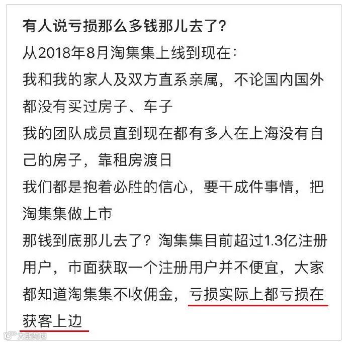 “淘集集目前超过1.3亿注册用户,市面获取一个注册用户并不便宜,亏损实际上都亏损在获客上。”