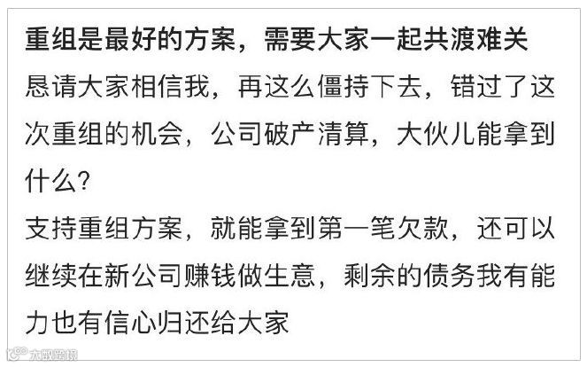 你们闹到法院只会鱼死网破,淘集集破产,公司清算,总财产不足以抵扣你们1%的货款。你们还是先来签一份协议回家吧,等公司上市后再还钱给你们,相信我!