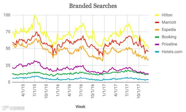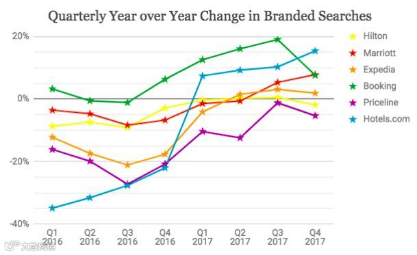 - Booking.com与Hotels.com全年搜索量稳步上升,Expedia小幅增长,Priceline则大幅下滑。