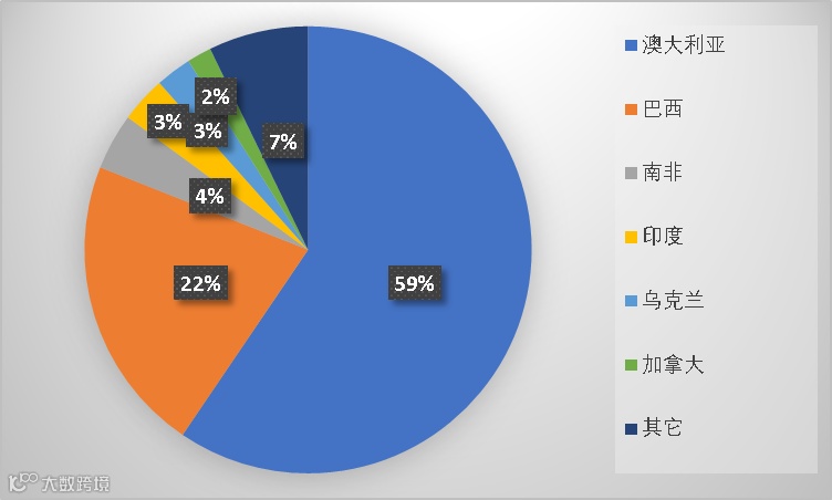 ▲2020年中国铁矿石进口来源国分布,数据来源:整理中华人民共和国海关总署网站,以贸易额计算