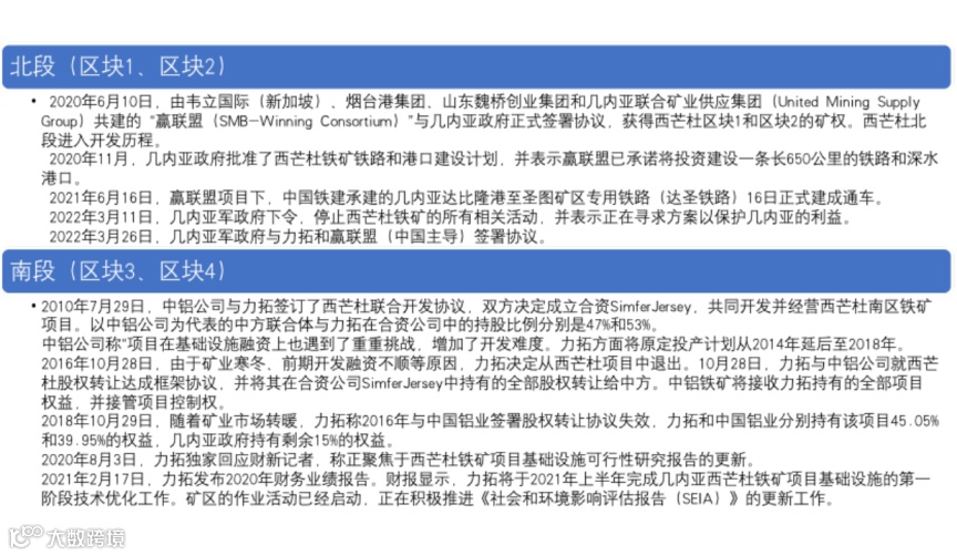 二是2020年6月10日,由韦立国际(新加坡)、烟台港集团、山东魏桥创业集团和几内亚联合矿业供应集团共建的 “赢联盟”取得招标胜利,开发西芒杜铁矿北段区块1和区块2。