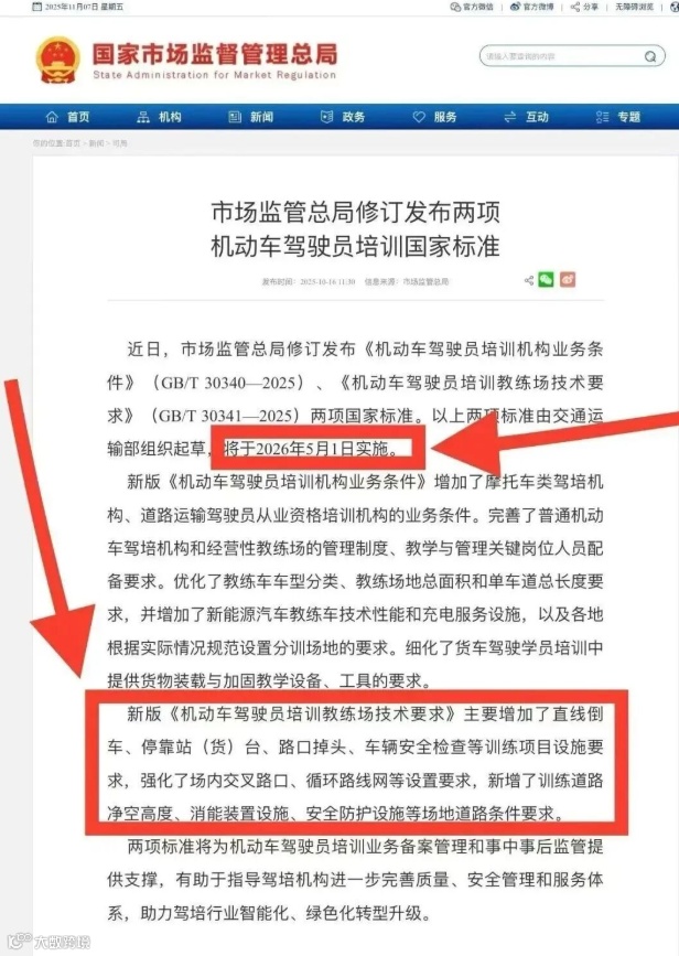 近日,市场监管总局重磅修订发布《机动车驾驶员培训机构业务条件》和《机动车驾驶员培训教练场技术要求》两项国家标准,将于2026年5月1日起实施。这意味着,驾考将迎来新一轮升级:科目二新增直线倒车、停靠站(货)台、路口掉头、车辆安全检查等4项,科目三增加恶劣天气模拟、模拟导航、突发场景处理等3项场景,理论题库(科目一/四)新增新能源与环保内容。驾考从“技能考核”转向“实战+安全意识”考验,难度提升20%-30%。过去十年改革浪潮从未停歇,2013年科目四诞生、2016年计时培训推广、2024年地方题库扩容……2026年,预计学费涨10%-15%、拿证周期从2-3个月拉长至4-5个月。还没考的学员,国庆后(10月8日起)抓紧“旧规窗口期”报名!本文原创深度解读超1000字,详解新增项目、影响分析、历史演变及备考攻略,助你避坑速通,早日上路!