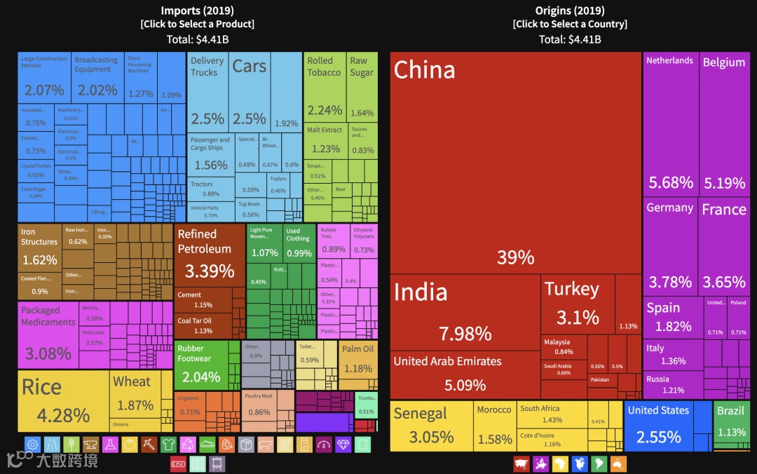 虽然采矿业的确在慢慢发展,但是它并没有让老百姓享受到什么好处。从经济结构上看,几内亚的各经济部门发展非常不协调,采矿业一家独大,农业在各种国际组织的持续输血下缓慢成长,服务业主要服务有钱人,制造业基本没有,日常用品全靠进口,最主要的进口商就是中国。