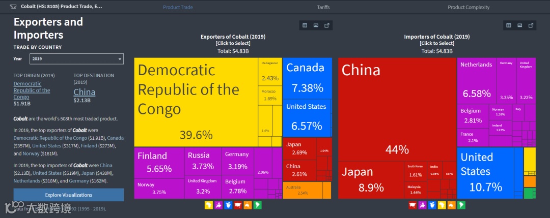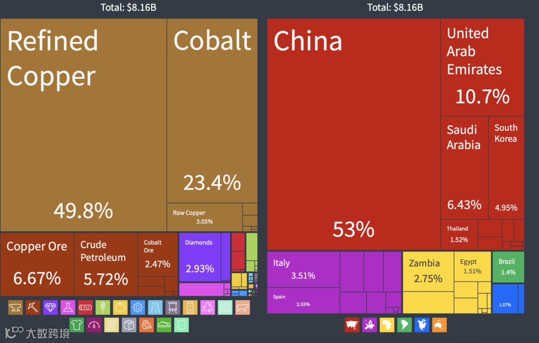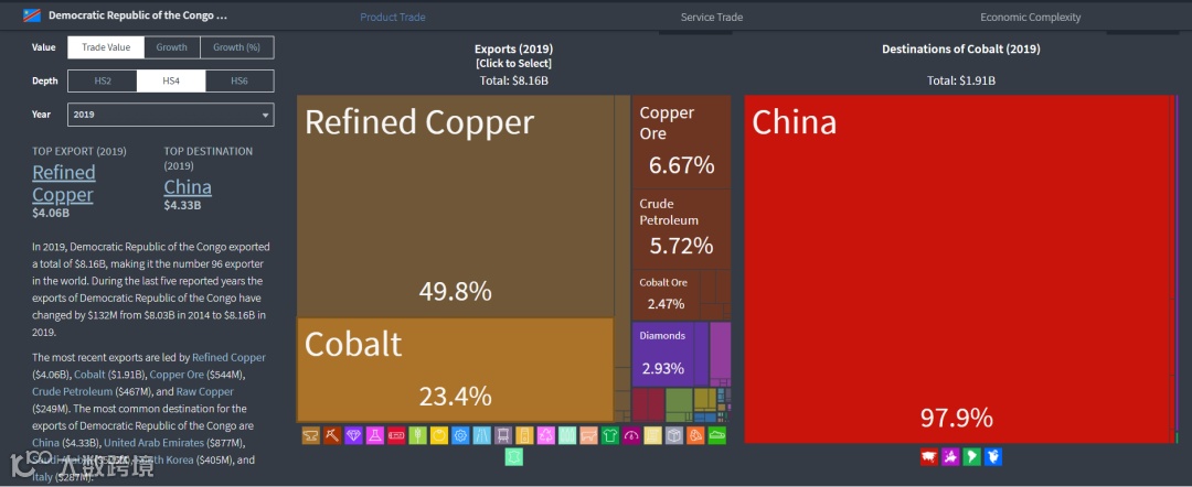 2016年,其国内50%以上的GDP来自矿业和农业,出口方面则几乎完全依赖于矿物。2019年80亿美元出口额中,超过98.3%都来自矿物及其加工产品,钴在其中占了将近1/3。而刚果出口的钴中,97.9%都卖给了中国。